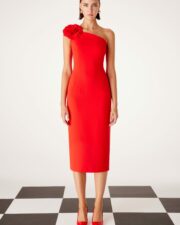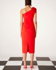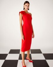 Mod.51508 de Carla Ruiz. Este elegante vestido asimétrico en color coral con flor en el hombro es ideal para cualquiera de tus eventos. Este modelo estara por largo tiempo dentro de tu gran fondo de armario.