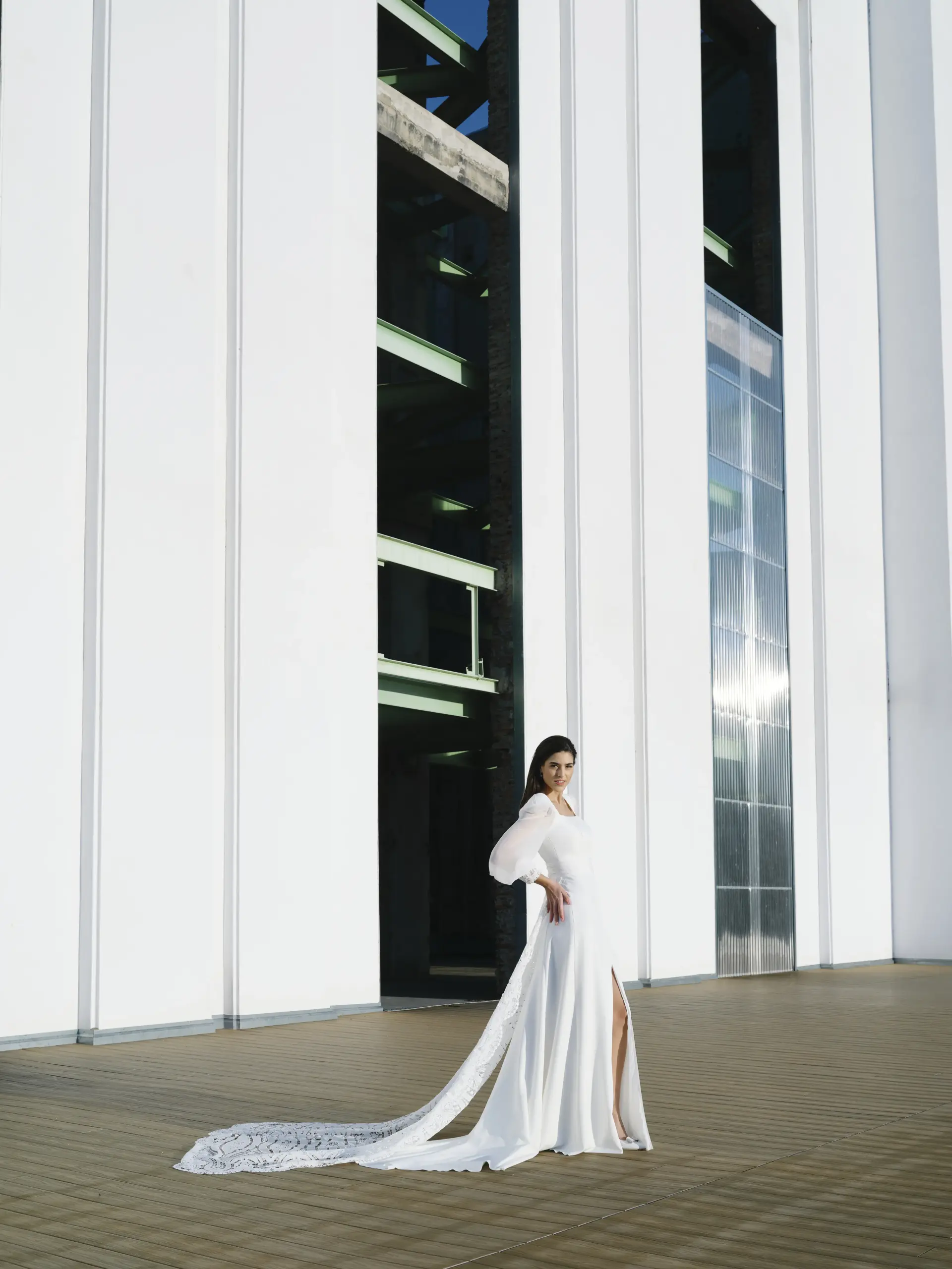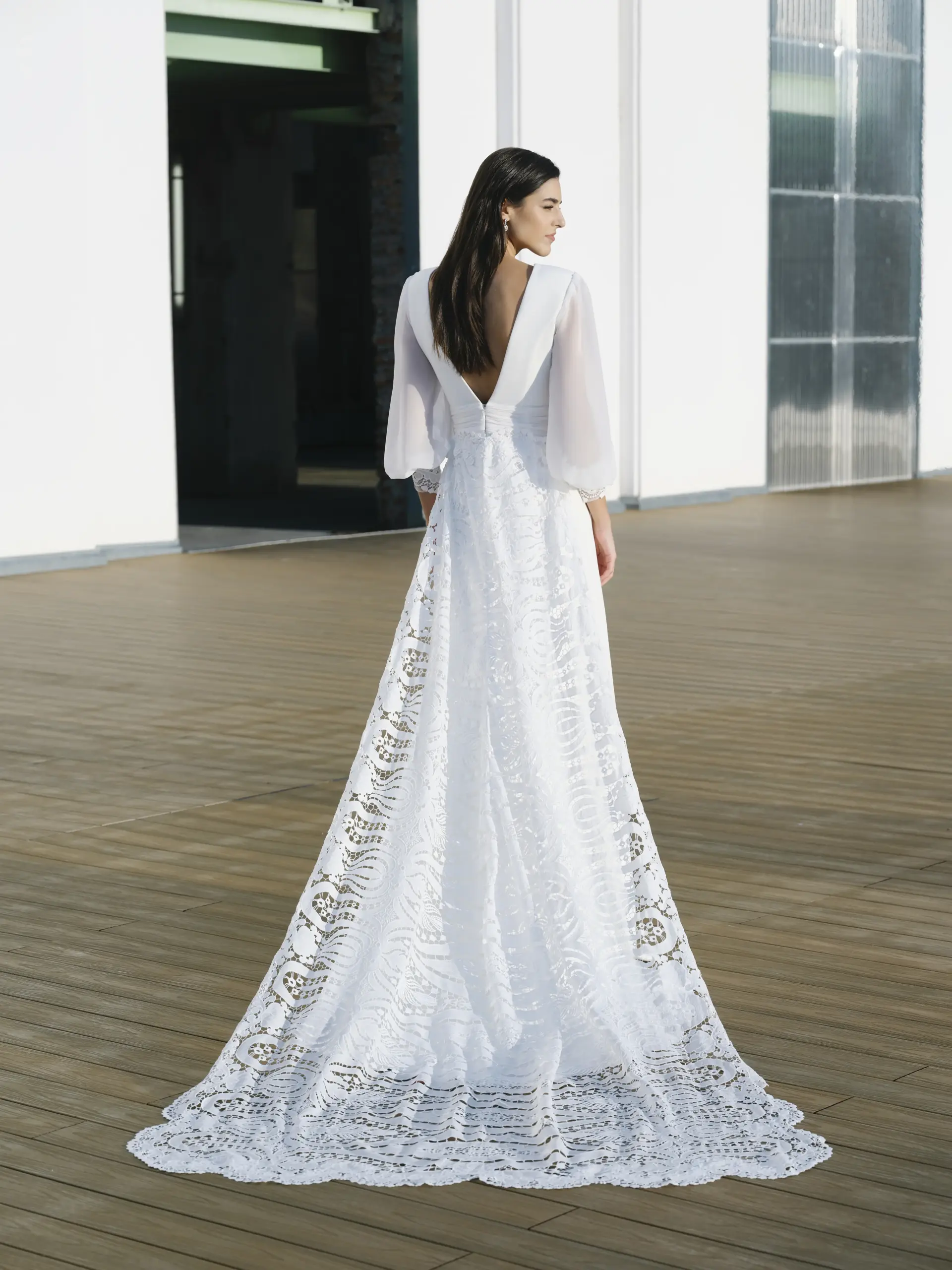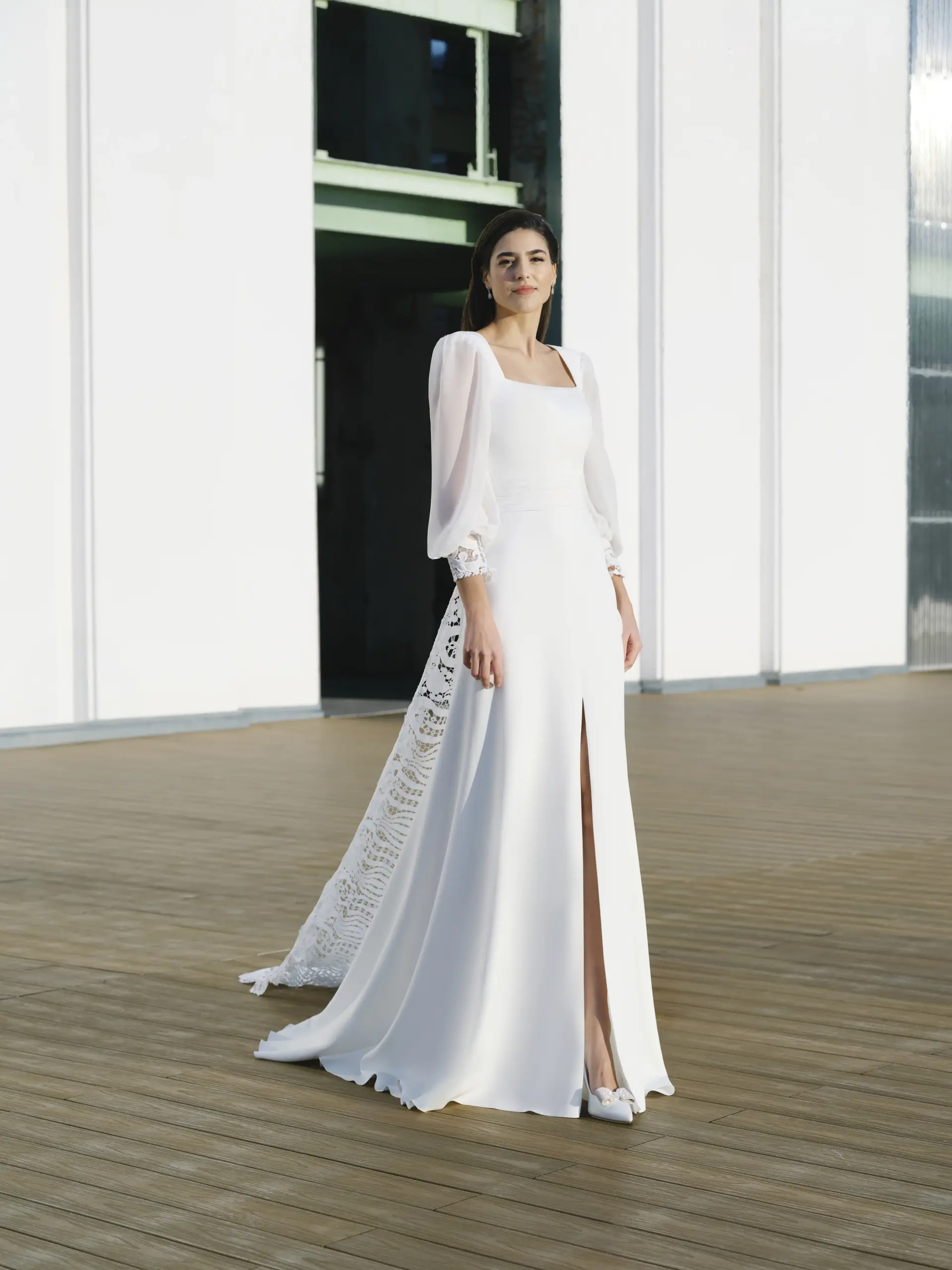 CACTUS-SILVIA FERNANDEZ. Vestido de novia en crepe con escote cuadrado, mangas abullonadas en gasa y espalda abierta en forma de V. Fajín fruncido en gasa y sobrecola troquelada que aporta textura y un efecto visual único.