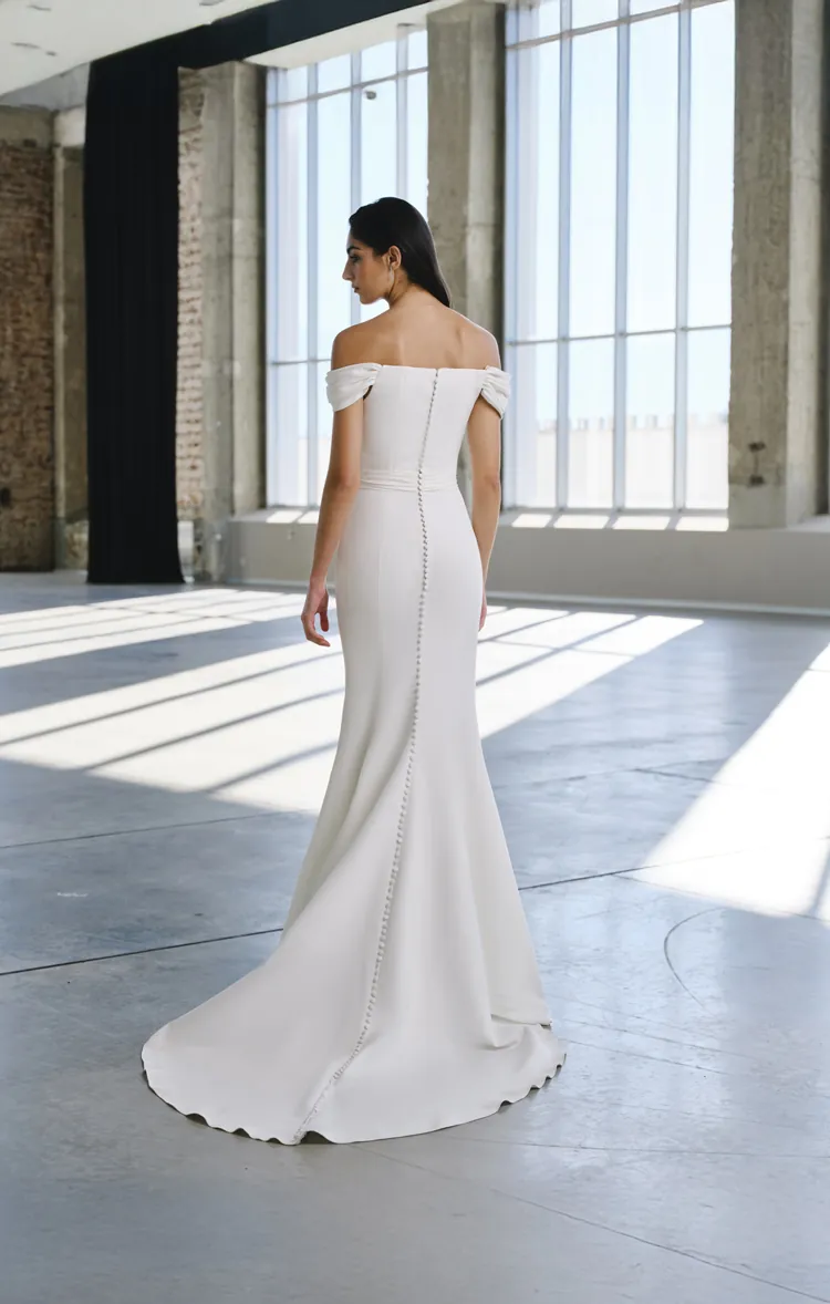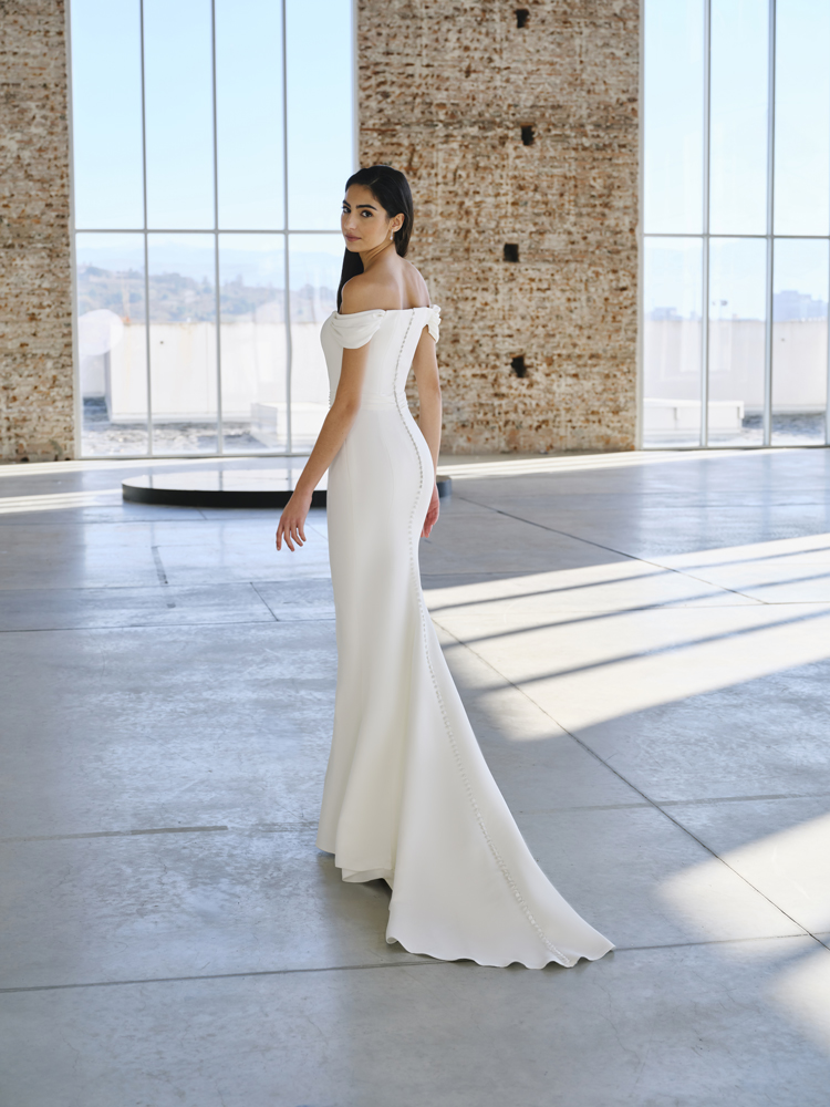 La cintura destaca por el fajín en crepe drapeado que da paso a una falda larga. En la parte trasera, una hilera de botones forrados recorre la espalda desde el escote hasta el final de la cola dejando un acabado impecable.