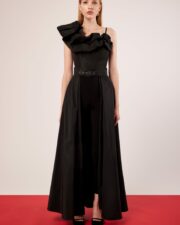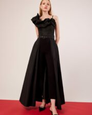 Vestido Carla Ruiz mod. 51552. Conjunto de falda pantalón y top asimétrico con volante. Este modelo es super estiloso y te hará sentir el centro de todas las miradas.
