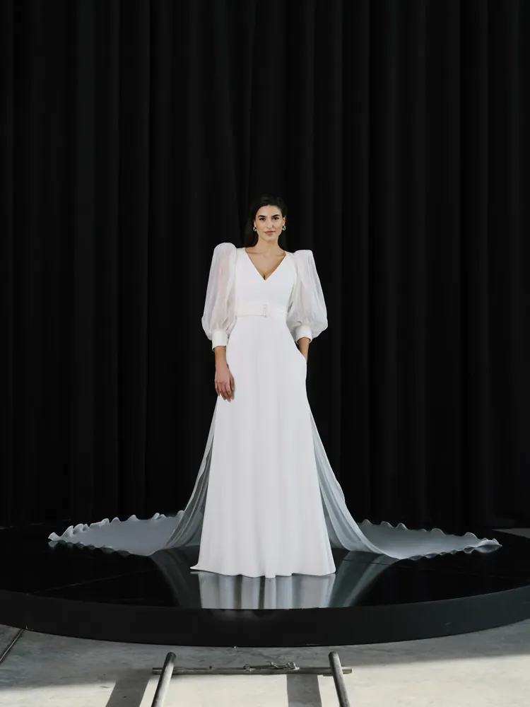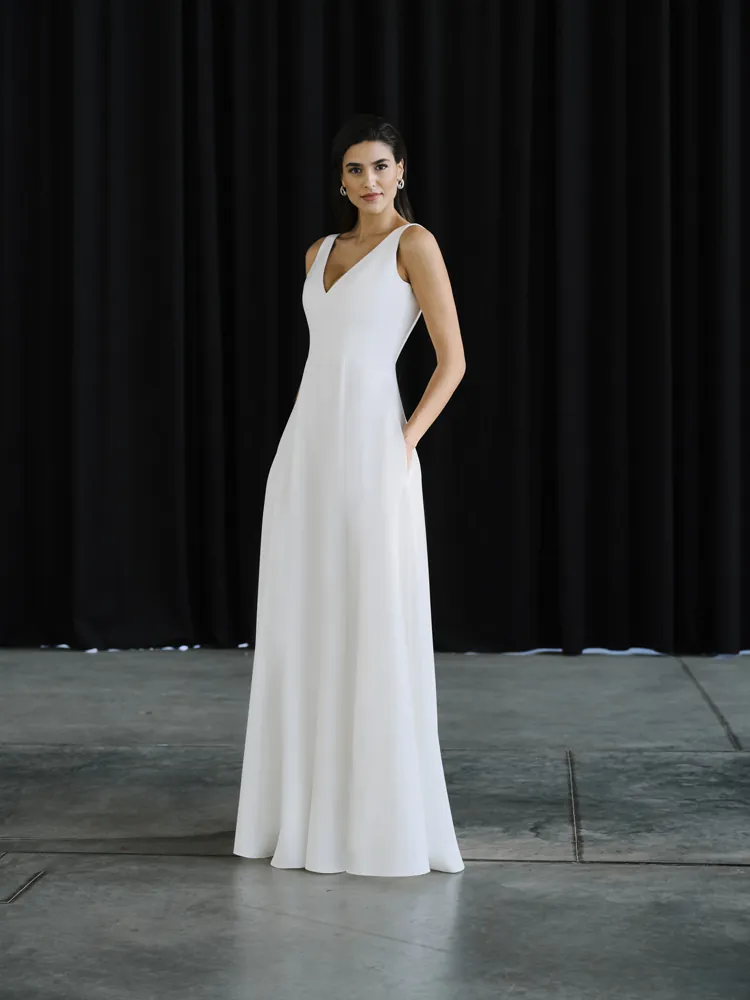 Vestido de novia versátil que combina dos looks en uno. Confeccionado en crepe y de cuerpo entallado, presenta un escote en pico y espalda abierta. La falda destaca por su caída fluida y añade un toque divertido con los bolsillos.
