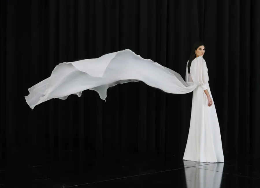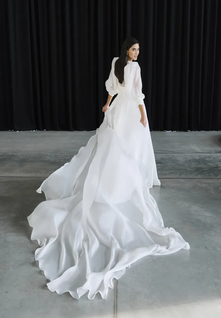 El vestido se complementa con un abrigo desmontable de organza, caracterizado por unas mangas abullonadas acabadas con adorno de botones en los puños.