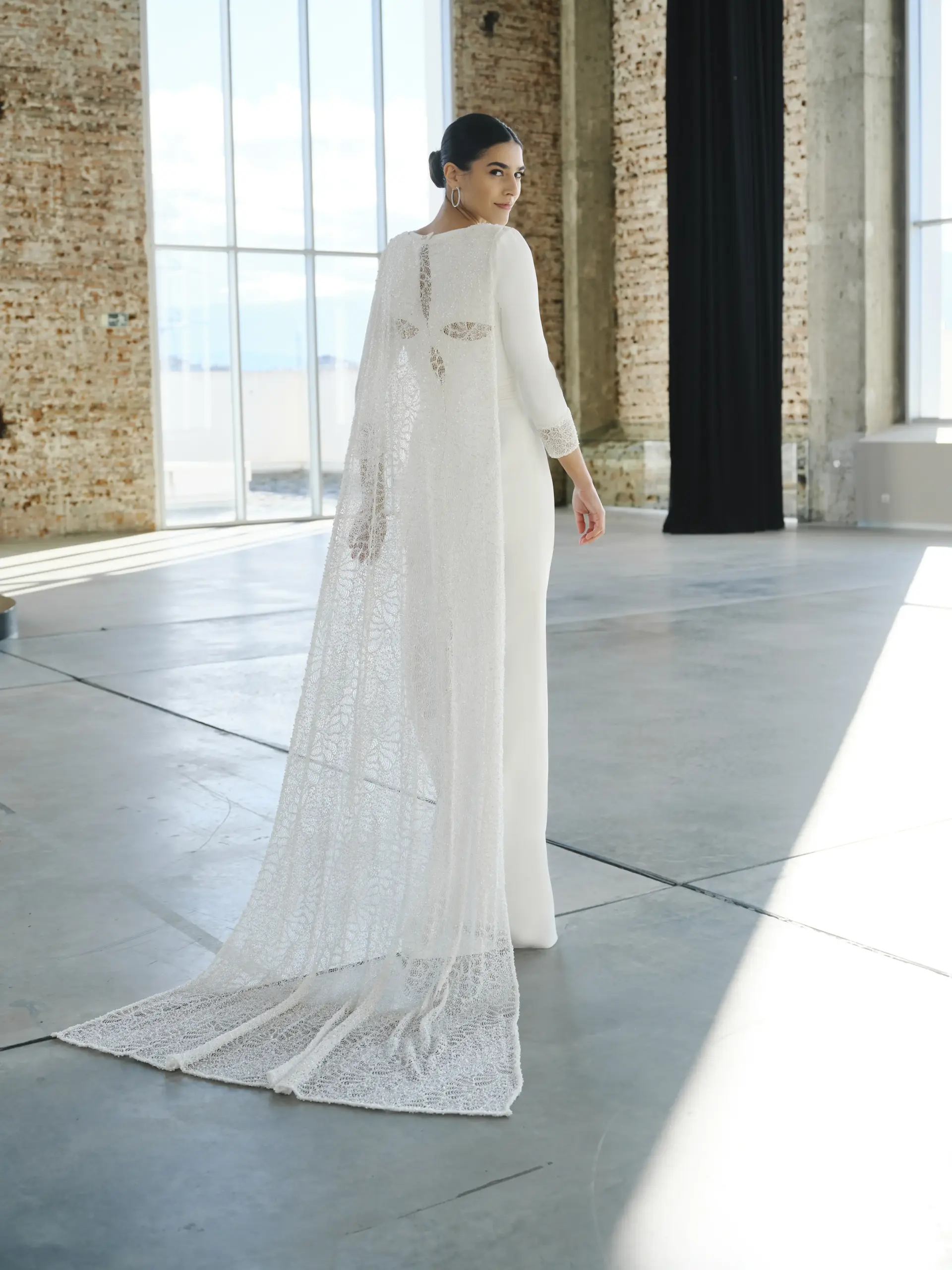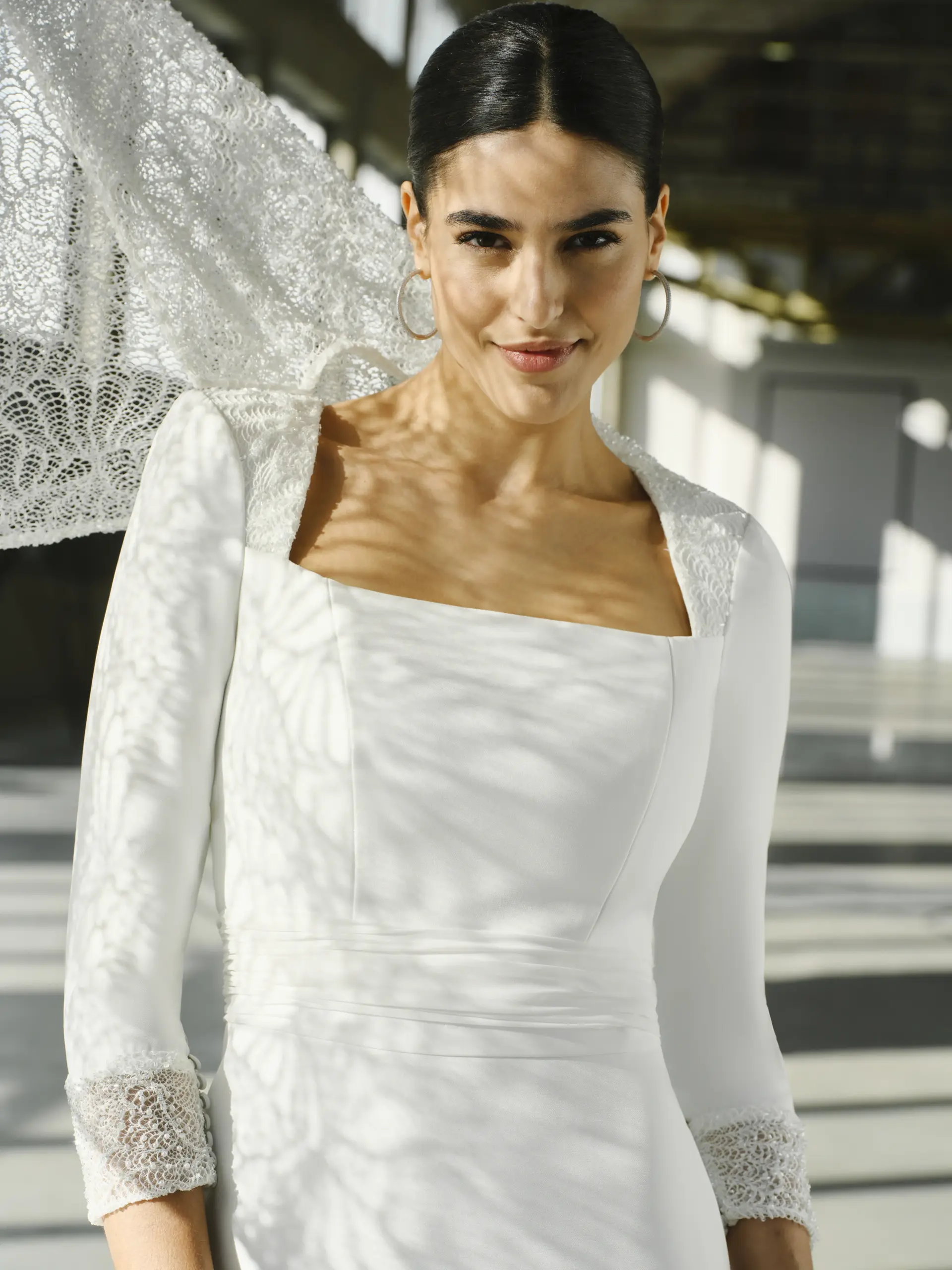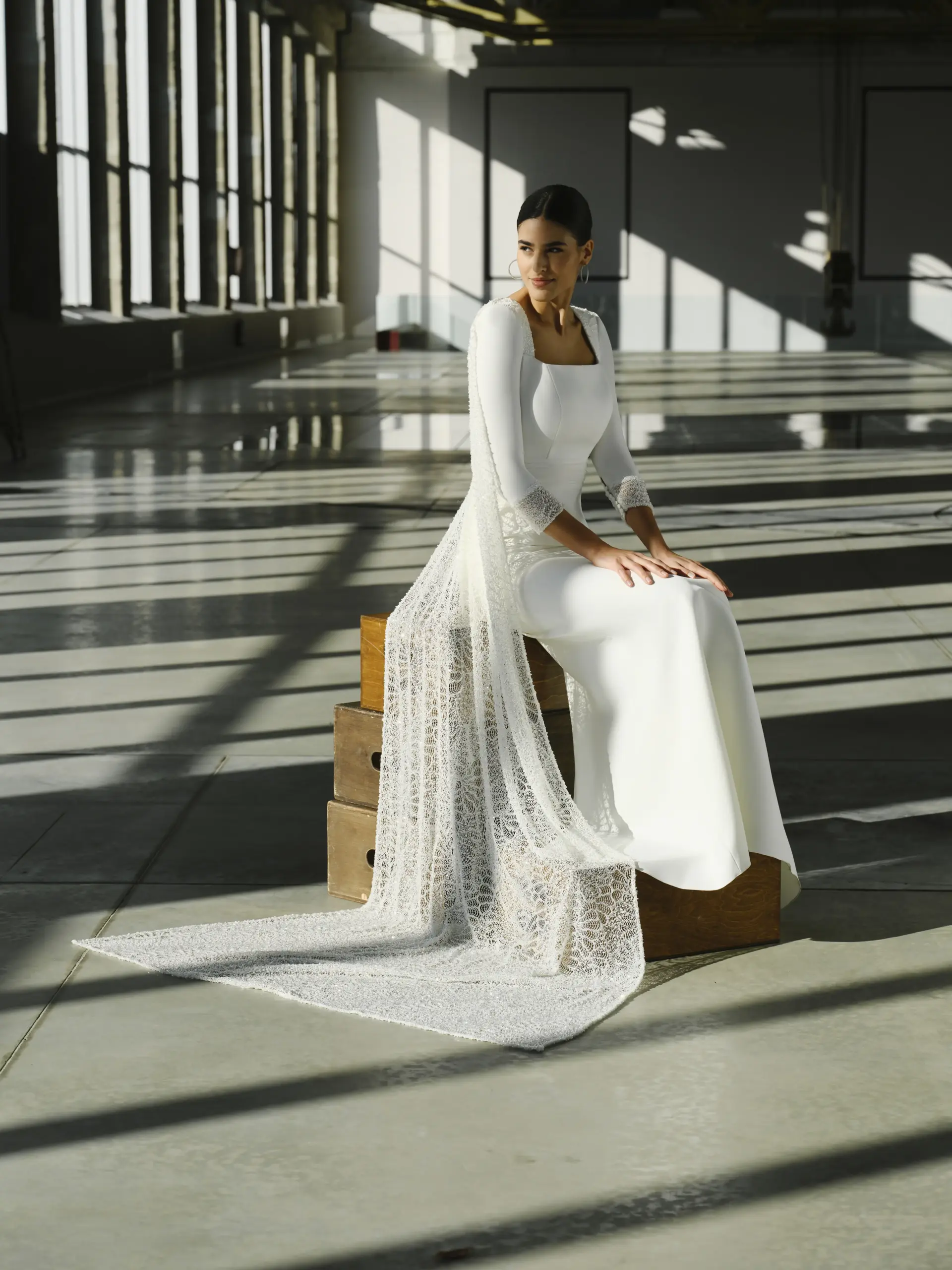 Vestido de novia confeccionado en crepe que presenta un escote cuadrado. Tanto sus hombros como sus puños están realizados en tul bordado con pedrería. Un delicado fajín de gasa, marca la cintura y la espalda sorprende con cut out y falda con botones joya. La capa también en pedrería que nace desde los hombros, te hará brillar como nunca.