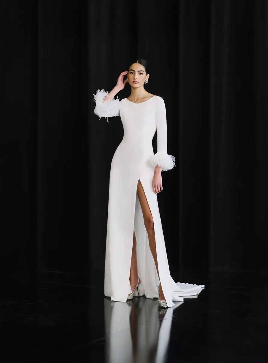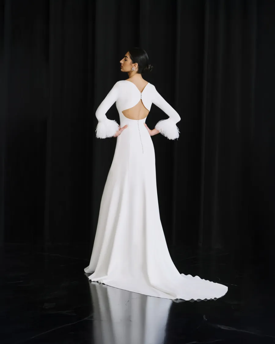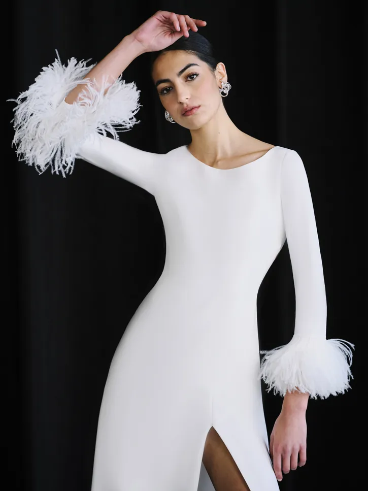 Vestido de novia confeccionado en crepe, con líneas limpias que abrazan la silueta con elegancia y sobriedad. Las plumas en los puños aportan un toque sofisticado y glamuroso, perfecto para una novia con personalidad.
