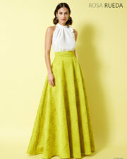 Conjunto dos piezas. Top de gasa con escote halter anudado con una lazada y falda de capa en brocado.