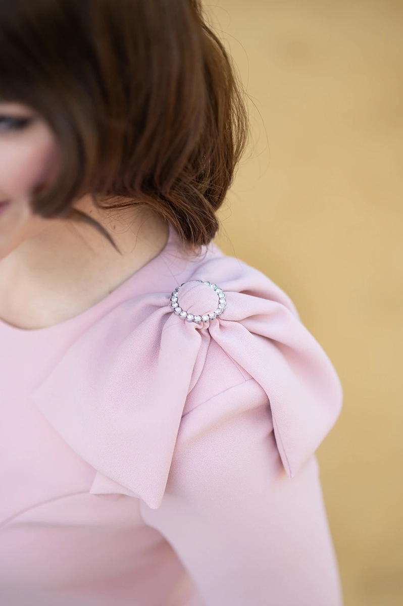 Cuerpo con mangas largas, cuello redondo, lazo en hombro izquierdo, cierre de cremallera y borlón flecado a mano.