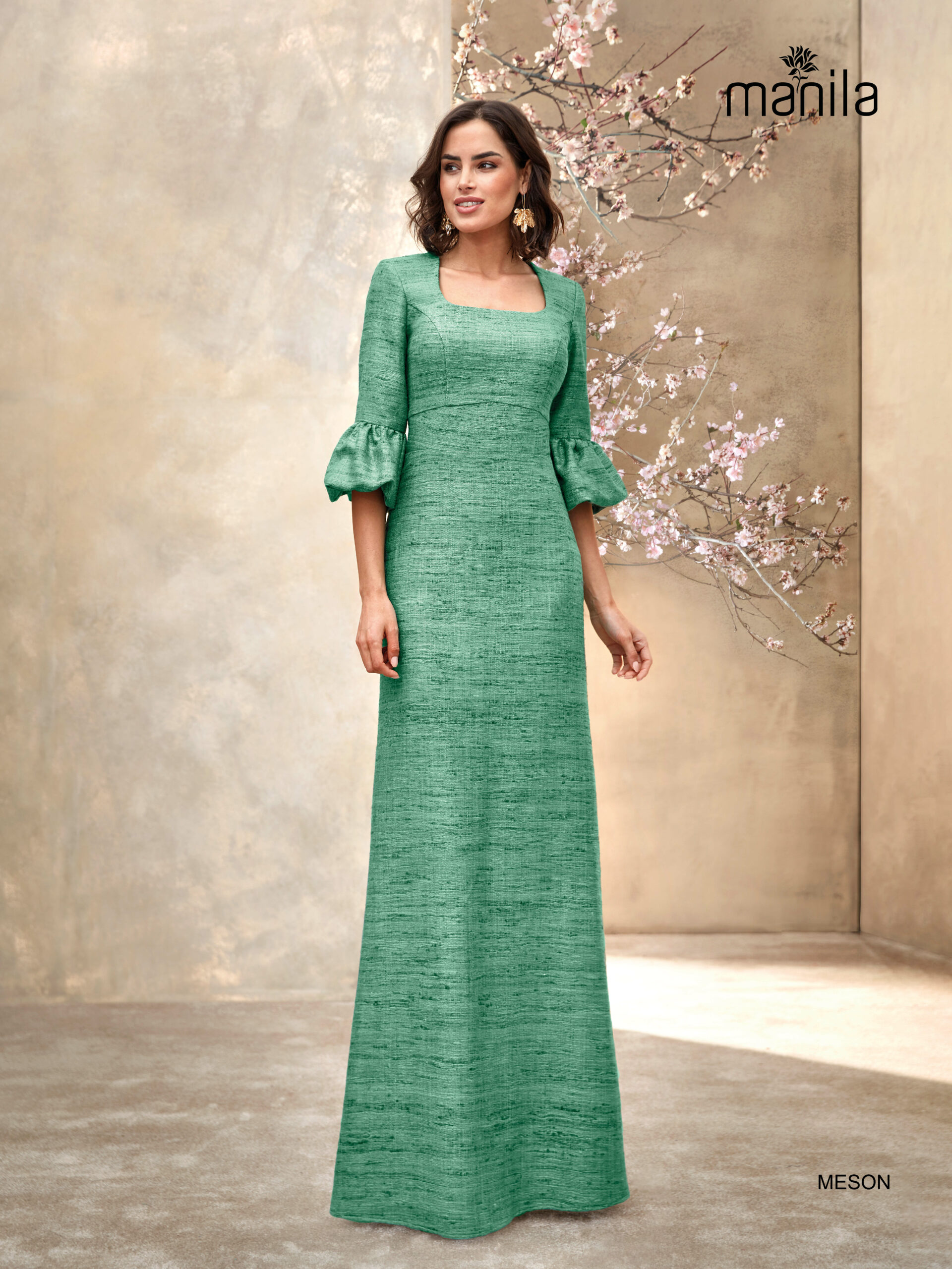 Escote cuadrado mu definido que aporta un aire moderno y estructurado, las mangas francesas que terminan en forma tulipán dándole un toque romántico y dinámico al diseño.