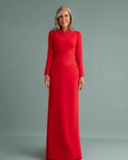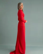 Vestido en triacetato con abertura en V en el escote y manga larga. Drapeado en georgette realizado a mano que cruza el delantero y espalda.  Dos opciones, rojo y azul ultramar.