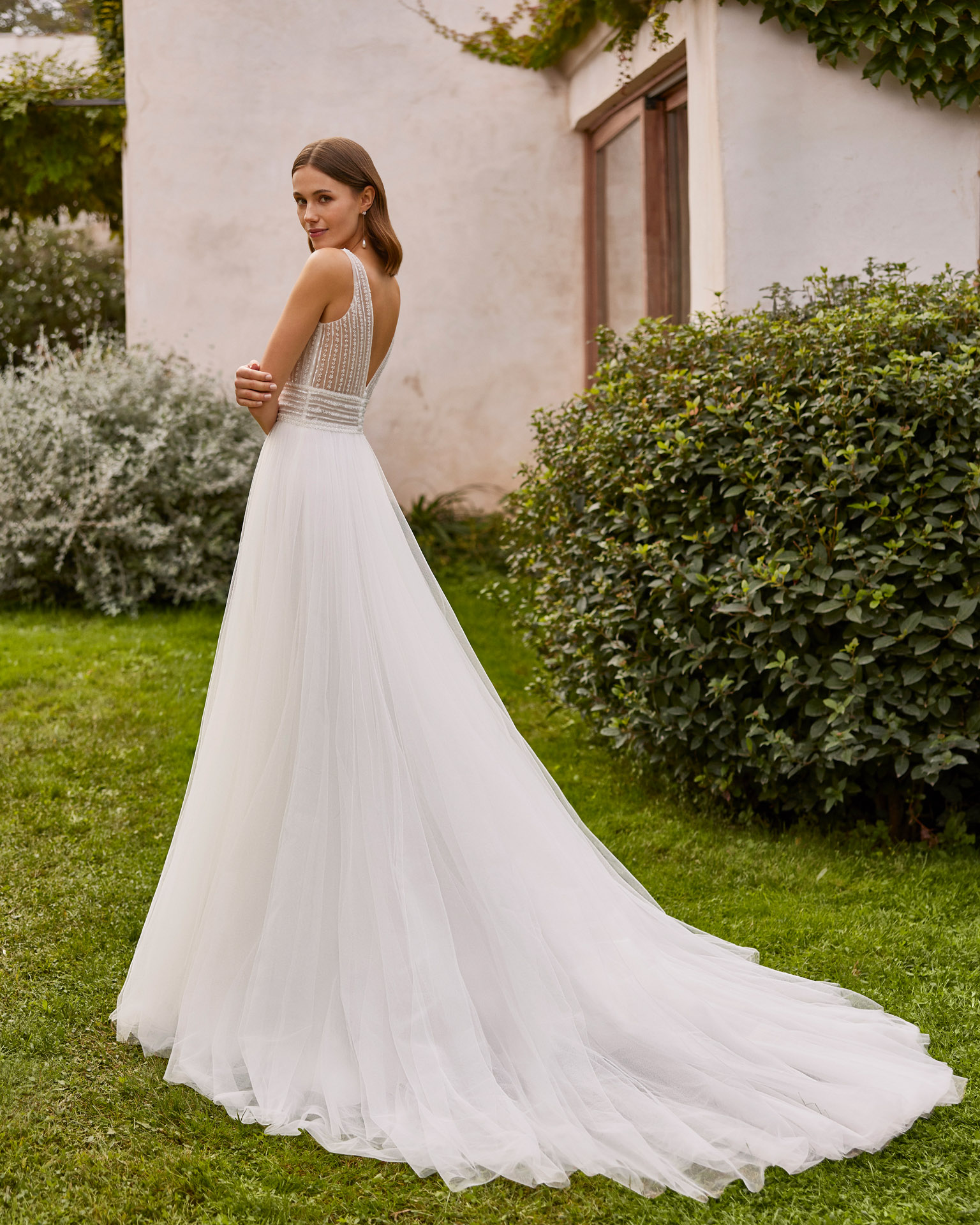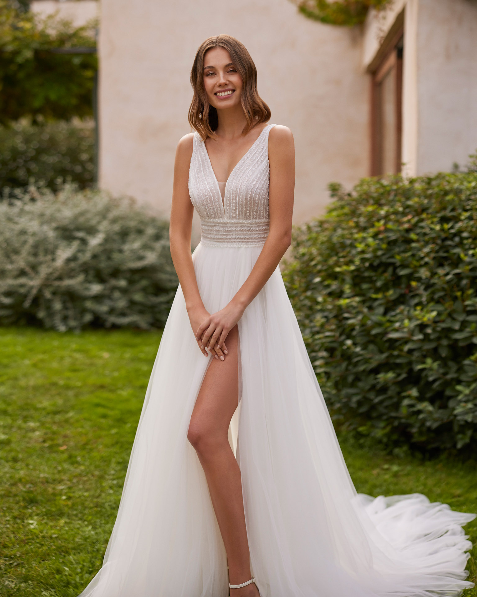 NUMAT-ALMA NOVIA. Vestido de novia en linea A. Confeccionado en tul con pedreria, escote pico, tirantes y espalda en V con abertura lateral en falda.
