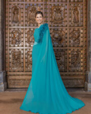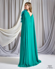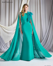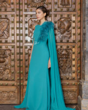 Elegante vestido fiesta, ideal para madrina o madre de novia. Confeccionado en crepé y georgette, con elegantes mangas que formar una capa y el toque de plumas en el cuerpo que le aporta empaque y prestancia.