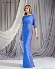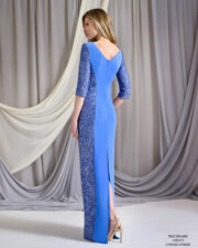 Elegante vestido de fiesta.  Este vestido azul, con su diseño de mangas tres cuartos y detalles brillantes en los laterales y las mangas, es ideal para madrinas o madres de novia que desean ser la invitada perfecta. La falda fluida y el corte impecable garantizan comodidad y estilo en cualquier evento especial. Completa tu look con accesorios sencillos para un estilo refinado y encantador.