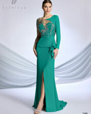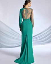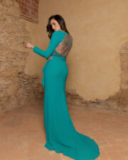 Vestido largo verde esmeralda con transparencias bordadas en la parte superior y mangas largas. Incluye abertura en la falda y detalle cinturon en la cintura, ideal para eventos de alta elegancia.