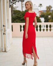 Sofisticado vestido de Couture Club con escote cuadrado y flecos en falda, que le dan un movimiento impresionante al look.